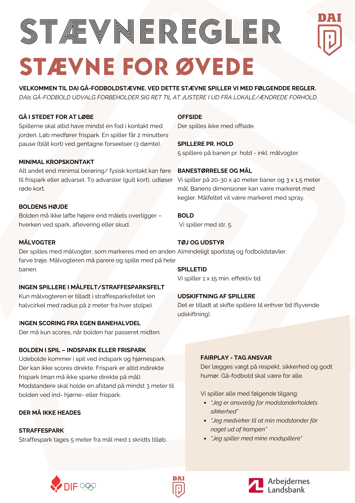 Uanset niveau og erfaring kan jeres forening starte gå-fodbold op. Vi har udviklet et øvelseshæfte med god inspiration til øvelser og opbygning af en træning, hvor både balance, puls og sjove boldlege udfordrer jeres fysik og styrker samværet. DAI hjælper også din forening til at være med i lokale gå-fodboldturneringer for at styrke fællesskabet og konkurrere med andre foreninger.